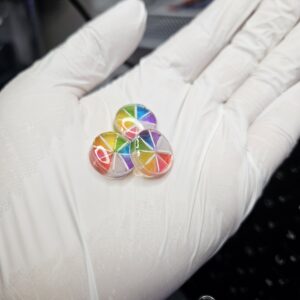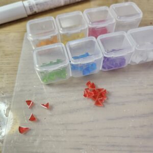 この写真を見てお分かりかと思いますが、虹色の飴ちゃんは三角形の小さなパーツからちまちまと手作りしています。