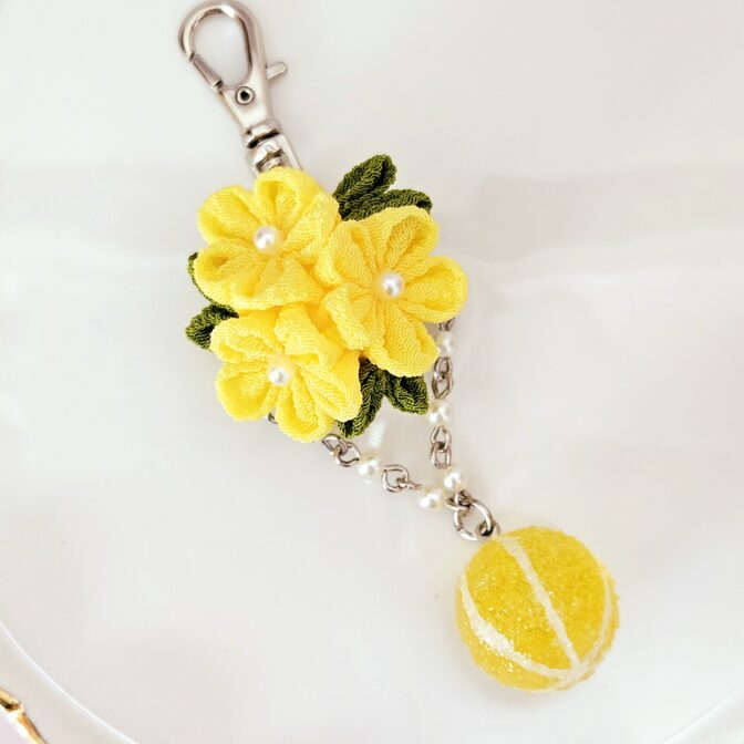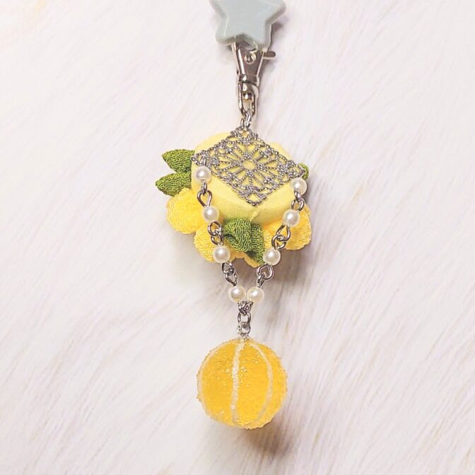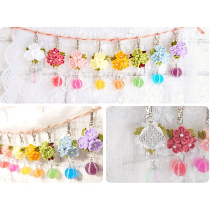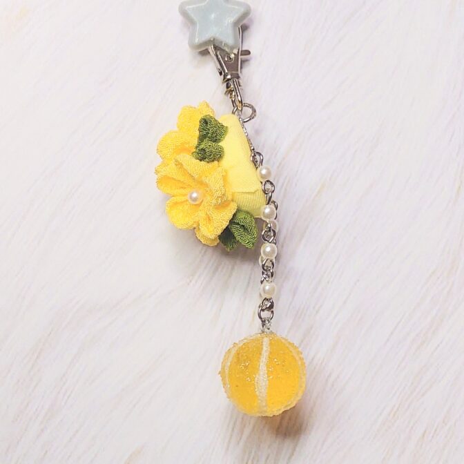 ちりめんつまみ細工で作った寄せ花モチーフと、レジンで作った飴ちゃんの、ころんとかわいいキーチャームです。 飴部分の線は、ひとつひとつ手描きしております。