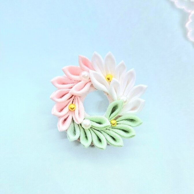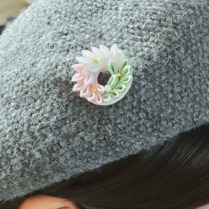 ひとつ5ミリほどのつまみ細工たちが織り成す、切れ目のない輪。